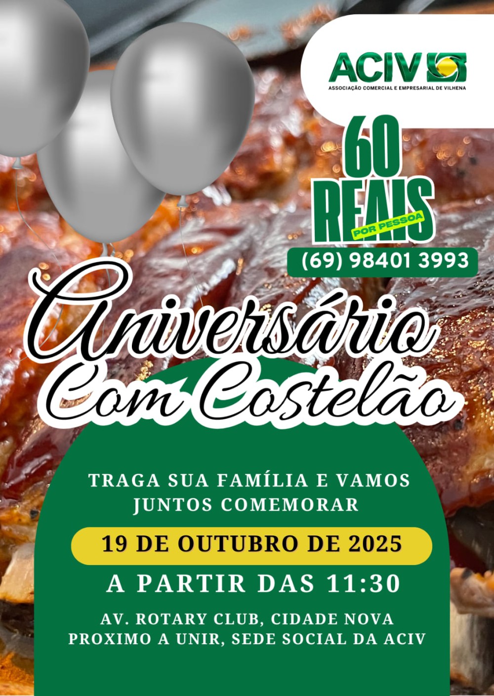 Associação Comercial e Empresarial de Vilhena (ACIV) está em clima de comemoração! No dia 19 de outubro de 2025, a entidade realiza um almoço especial com costelão, em celebração a mais um ano de conquistas ao lado da classe empresarial de Vilhena.