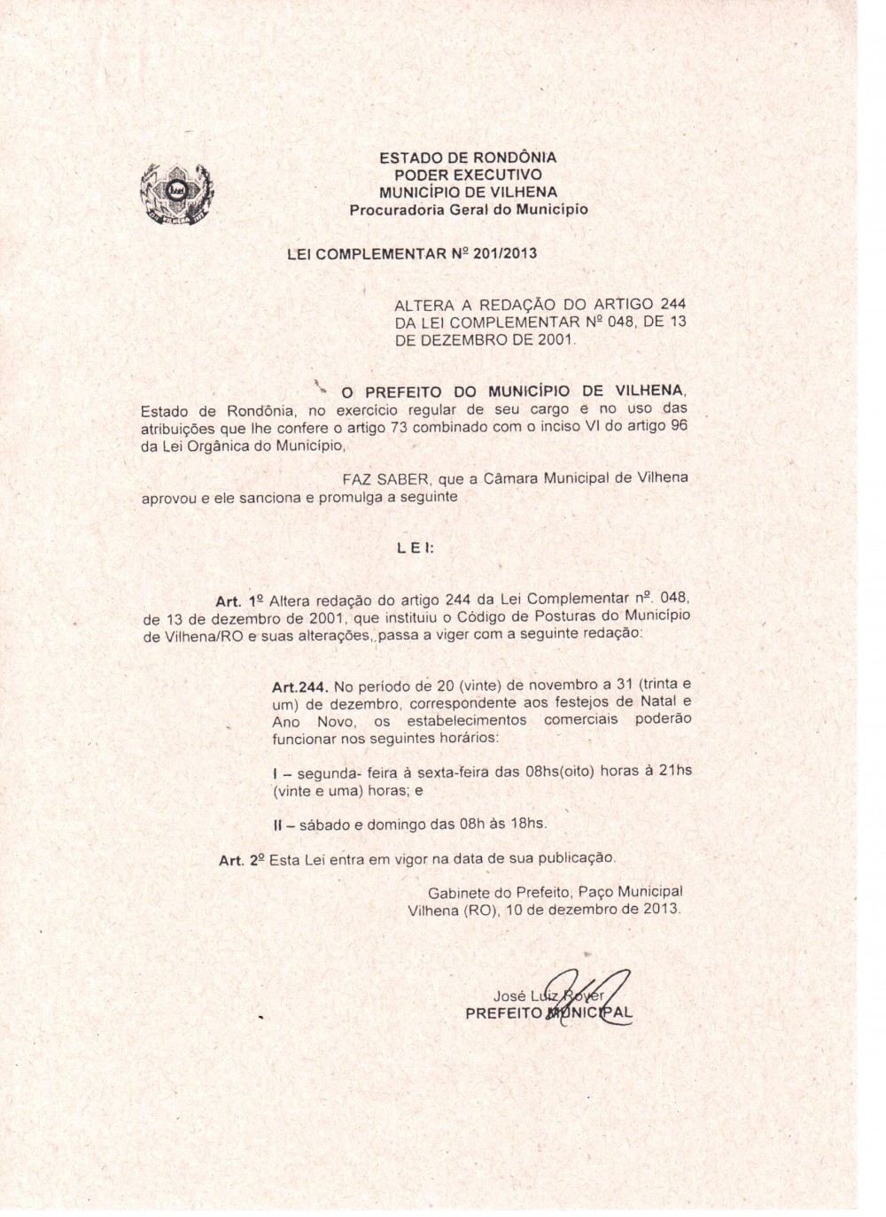 Conforme Lei Municipal Complementar nº 201/2013 (em anexo)